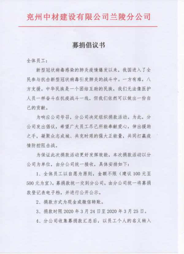 蘭陵分公司下發(fā)了《募捐倡議書》,堅(jiān)持自覺自愿與量力而行的原則,呼吁全體員工積極參與,奉獻(xiàn)愛心,捐款助力抗擊疫情。分公司經(jīng)理龔士朋同志帶頭捐款,以實(shí)際行動(dòng)做表率,起到很好的模范作用。在龔經(jīng)理的帶動(dòng)下,分公司全體員工積極響應(yīng),紛紛捐款,每一名員工都獻(xiàn)出一份愛心。