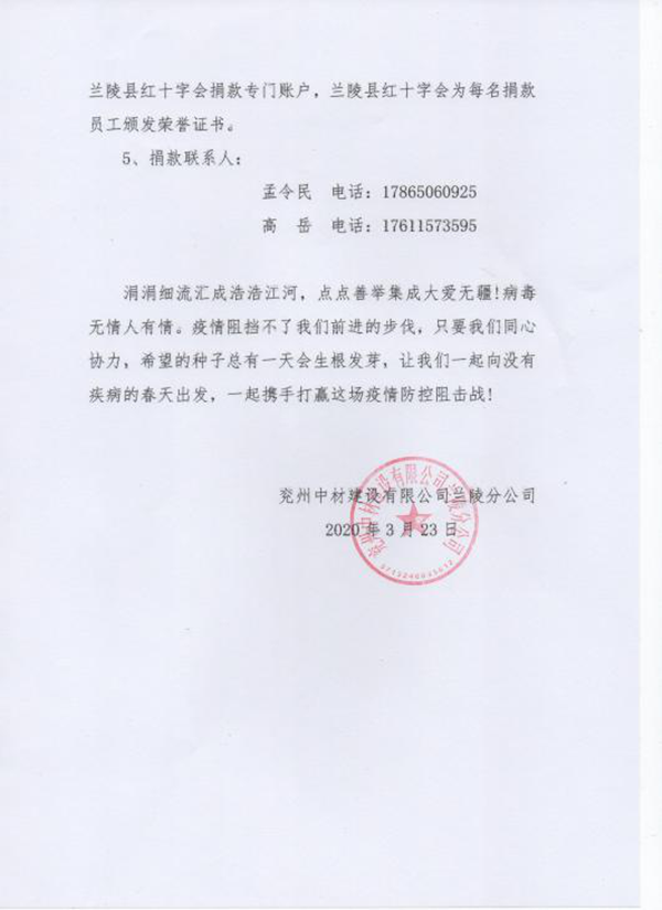 陽春三月,乍暖還寒。全國(guó)疫情防控工作取得重大勝果接近尾聲之際,仍有很多人士奮斗在抗疫第一線。災(zāi)害無情,人間有愛,近日來,蘭陵分公司積極響應(yīng)公司號(hào)召,組織開展為防控新冠肺炎疫情捐款活動(dòng),助力新冠肺炎疫情防控工作。