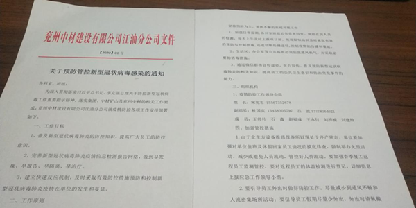 春節(jié)期間,一場突如其來的新冠病毒肺炎席卷全國,疫情防控形勢嚴(yán)峻。疫情就是命令,按照上級黨委要求,做出部署和安排,兗州中材第一時間成立由總經(jīng)理任組長的疫情防控領(lǐng)導(dǎo)小組,及時制定和啟動應(yīng)急預(yù)案,各分公司和項目部按照疫情成立了疫情防控組織機構(gòu),成立了疫情防控青年突擊隊,對所屬分公司積極推出疫情防控制度與措施,認(rèn)真宣傳,抓好落實,嚴(yán)防死守,阻斷疫情傳播,切實做好疫情防控和復(fù)工復(fù)產(chǎn)等各項工作,切實保障員工生命安全和身體健康。針對當(dāng)前疫情情況,分公司具體通過以下措施確保安全復(fù)工復(fù)產(chǎn): 一、分公司成立疫情防控領(lǐng)導(dǎo)小組,制定復(fù)工復(fù)產(chǎn)方案,分公司經(jīng)理任組長,領(lǐng)導(dǎo)小組按照當(dāng)?shù)卣?/span>與公司要求,嚴(yán)格落實疫情期間的消殺管控及登記制度,并與當(dāng)?shù)?/span>政府、業(yè)主加強溝通,將感染風(fēng)險降至最低。