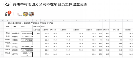 三、加強員工管理,落實檢查制度 分公司建立多種檢查制度,通過現(xiàn)場人員現(xiàn)場檢查、在項目隔離人員與未返工員工自查等多種形式進行人員健康狀況監(jiān)測,并如實記錄,如有異常者及時送醫(yī)就診,做到“早發(fā)現(xiàn),早隔離,早上報,早治療”,切斷傳播途徑,杜絕疫情蔓延。 1、現(xiàn)場人員檢查