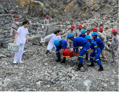 演練開(kāi)始,總指揮張鵬收到現(xiàn)場(chǎng)有發(fā)生塊石滾落,造成現(xiàn)場(chǎng)技術(shù)員腿部受傷請(qǐng)求救援的緊急報(bào)告,立即下達(dá)指令啟動(dòng)分公司應(yīng)急預(yù)案,并對(duì)本次救援進(jìn)行全面組織部署,對(duì)分公司警戒保衛(wèi)組、搶先救援組、醫(yī)療救護(hù)組、通訊聯(lián)絡(luò)組等下達(dá)指令,各小組在接到指令后立即響應(yīng)應(yīng)急預(yù)案,第一時(shí)間到達(dá)事故發(fā)生地,按秩序組織搶險(xiǎn)救援,對(duì)傷員進(jìn)行緊急救治并對(duì)事故發(fā)生地進(jìn)行警戒隔離。