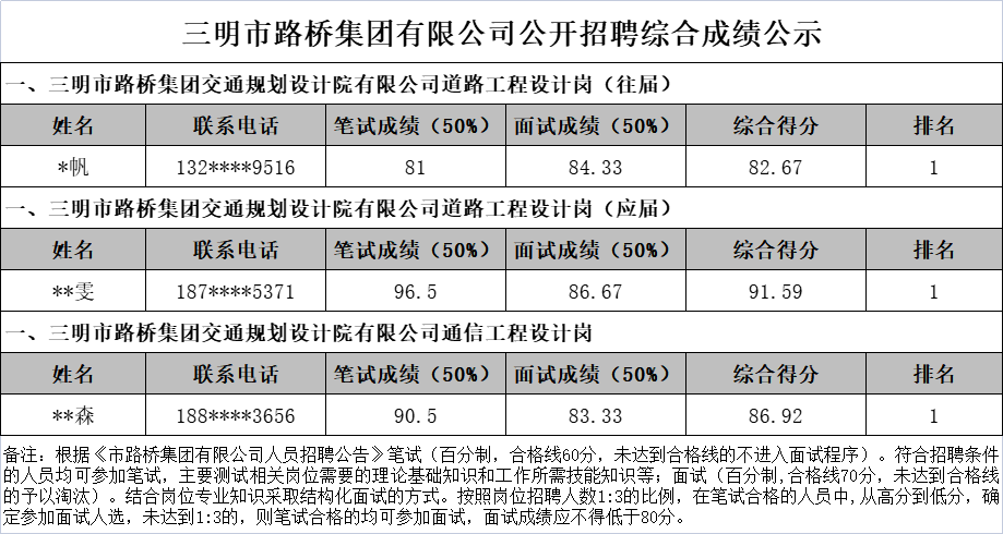 根據(jù)《市路橋集團有限公司人員招聘公告》,現(xiàn)將市路橋集團有限公司公開招聘工作人員綜合成績及排名情況公示如下:
