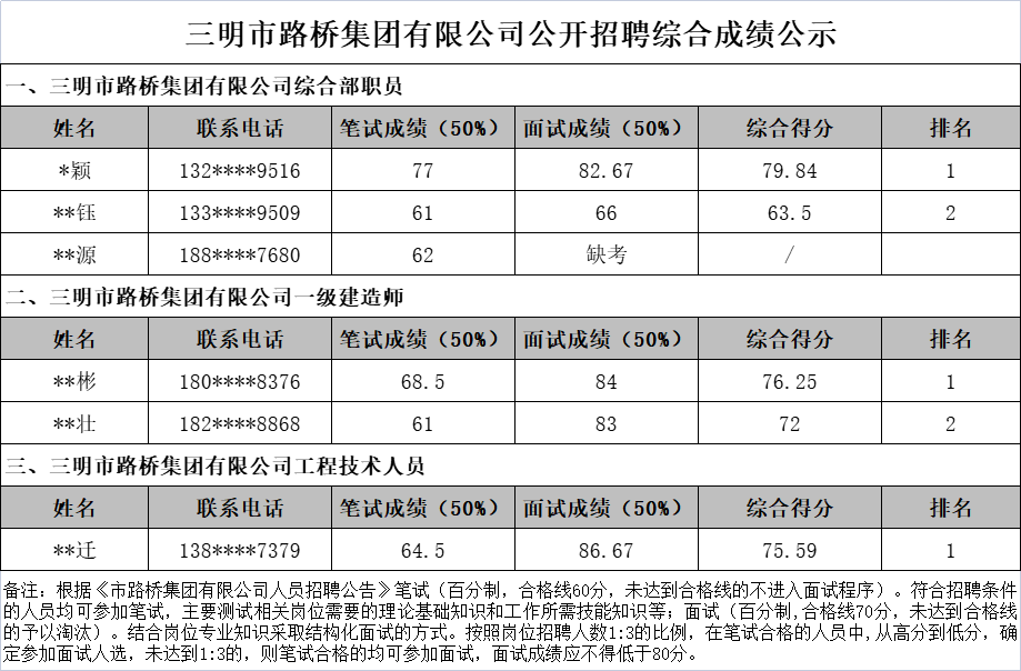 根據(jù)《市路橋集團(tuán)有限公司人員招聘公告》,現(xiàn)將市路橋集團(tuán)有限公司公開招聘工作人員綜合成績(jī)及排名情況公示如下: