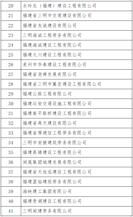 三、公路工程勞務(wù)隊(duì)伍信息庫(kù)根據(jù)提供注冊(cè)人員情況實(shí)行動(dòng)態(tài)管理,我司將適時(shí)公布。同時(shí)自本通報(bào)發(fā)布之日起,明路橋[2020]36號(hào)文發(fā)布的原三明市路橋集團(tuán)有限公司公路工程勞務(wù)隊(duì)伍信息庫(kù)名單不再適用。