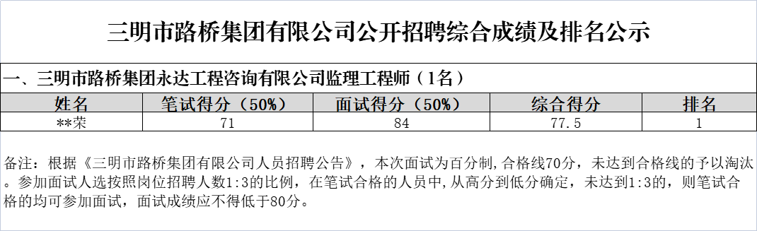 根據(jù)《市路橋集團有限公司人員招聘公告》,現(xiàn)將市路橋集團有限公司公開招聘工作人員綜合成績及排名情況公示如下: