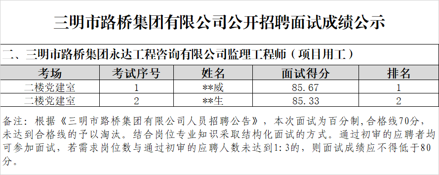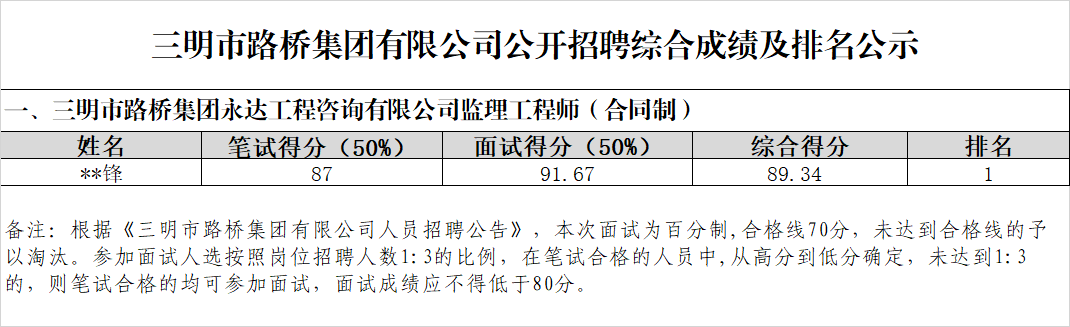 根據(jù)《三明市路橋集團(tuán)有限公司人員招聘公告》,現(xiàn)將市路橋集團(tuán)有限公司公開(kāi)招聘工作人員綜合成績(jī)及排名情況公示如下:
