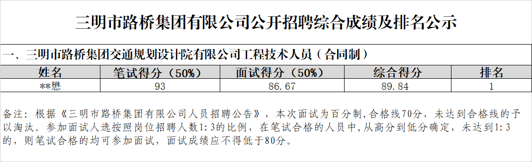 根據(jù)在三明市人力資源和社會保障局、三明市人民政府國有資產(chǎn)監(jiān)督管理委員會、三明市殘疾人聯(lián)合會聯(lián)合辦法的2025年三明市“職通未來?才聚三明”專場招聘會上發(fā)布招聘公告,現(xiàn)將市路橋集團有限公司公開招聘工作人員綜合成績及排名情況公示如下: