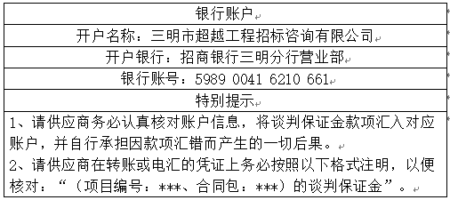 6.2采購(gòu)文件發(fā)售地點(diǎn):三明市超越工程招標(biāo)咨詢有限公司(地址:三明市三元區(qū)東乾路192號(hào)(匯鑫大廈)2606號(hào))購(gòu)買(mǎi)或?qū)①?gòu)買(mǎi)費(fèi)用轉(zhuǎn)賬至以下賬戶:
