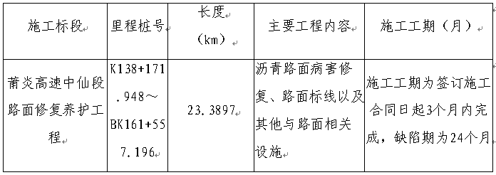 本遴選項目莆炎高速中仙段路面修復養(yǎng)護工程勞務協(xié)作建設資金來源為業(yè)主支付款,遴選人為三明市路橋集團昌盛公路工程有限公司。本項目已具備遴選條件,現(xiàn)對該項目進行庫內(nèi)遴選,并向三明市路橋集團有限公司工程施工勞務班組庫(公路工程類)內(nèi)單位以電子郵件形式發(fā)出通知。